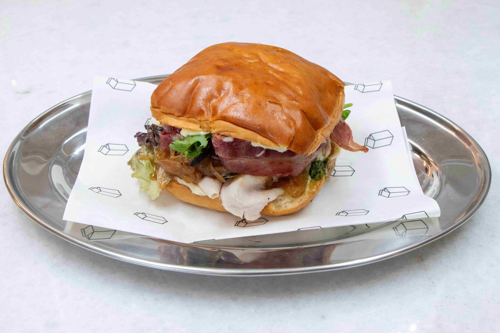 PECHUGA DE PAVO HORNEADA (150GR) + PESTO + TOCINO + QUESO CHIHUAHUA + CEBOLLAS CARAMELIZADAS + ALIOLI DE LA CASA + MIX GREENS + CUADRO CHAPATA NATURAL