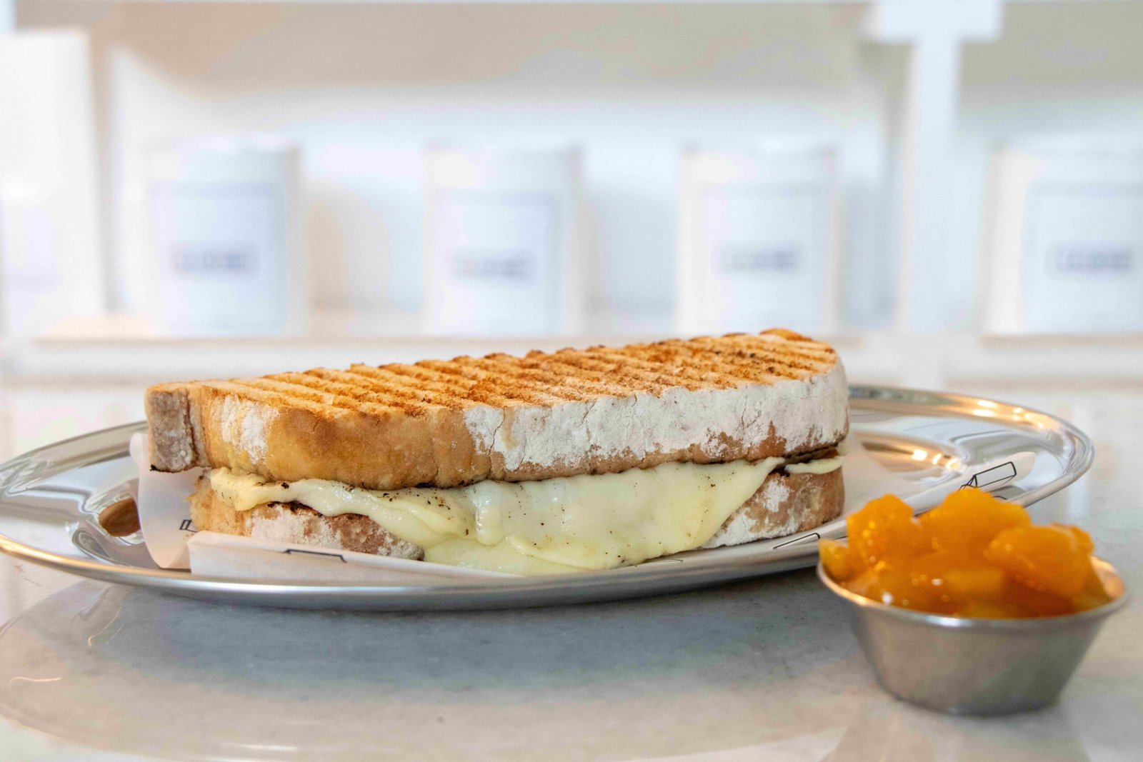 QUESO CHIHUAHUA (50 GR )+ QUESO CHEDDAR(50 GR) + ALIOLI DE LA CASA + PARMESANO SOBRE LA TAPA PARA SELLAR + PAN DE AJO + SIDE DE MERMELADA DE CHABACANO Y HABANERO