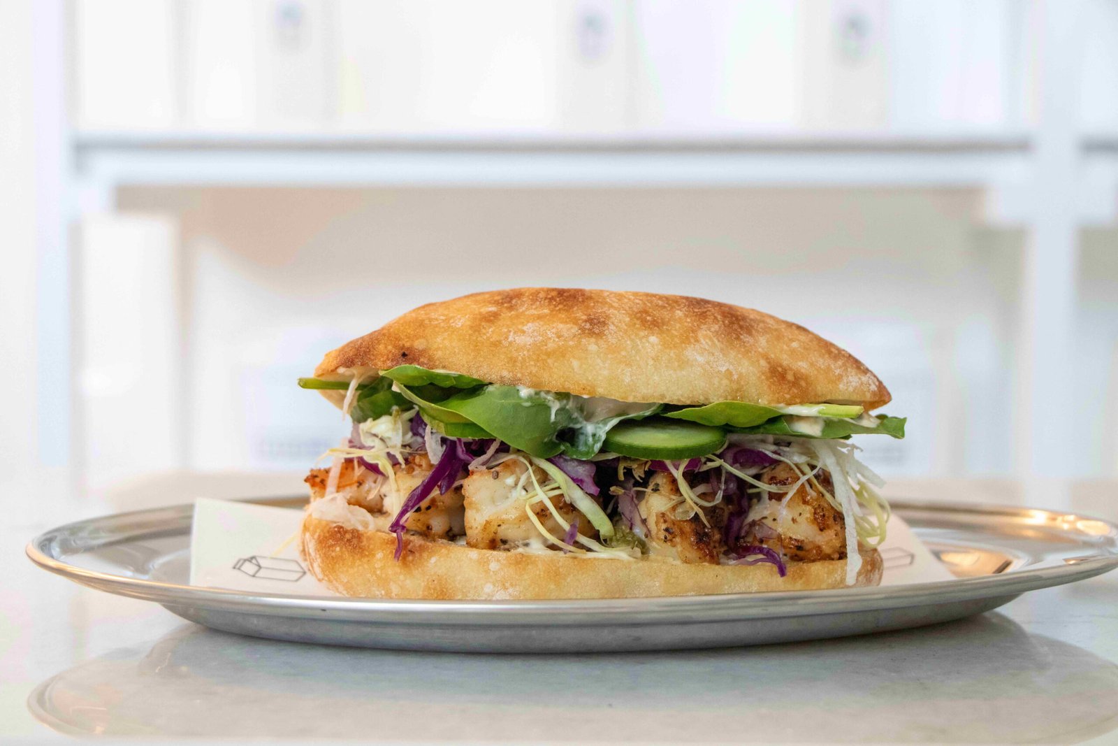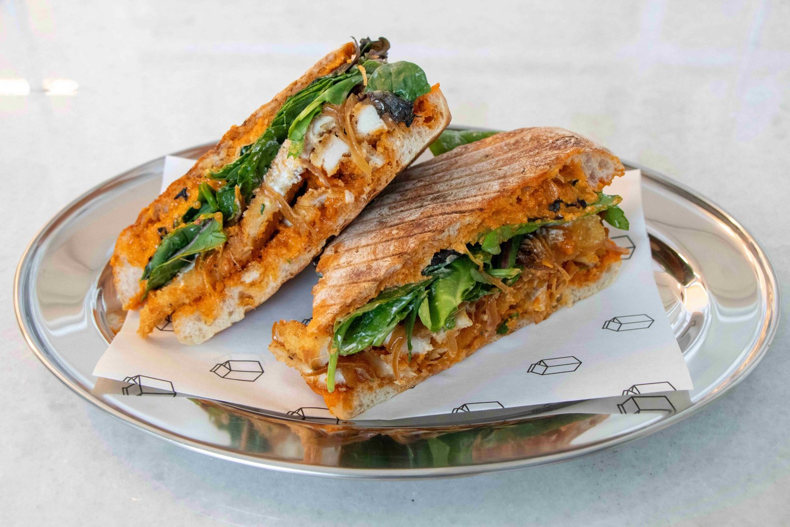 ROMESCO + PECHUGA EMPANIZADA(120GR) + MIX DE HOJAS CON ADEREZO DE YOGURT Y CILANTRO + CEBOLLA CARAMELIZADA + HOT HONEY CHILI OIL + CUADRO CHAPATTA NATURAL