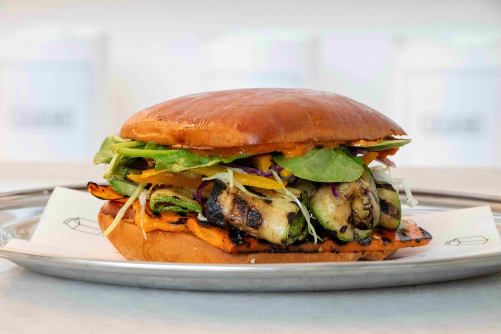 VEGETALES AL GRILL(160GR) + ROMESCO + ENSALADILLA DE COL MORADA Y BLANCA + MIX DE HOJAS + TABLA MASA MADRE