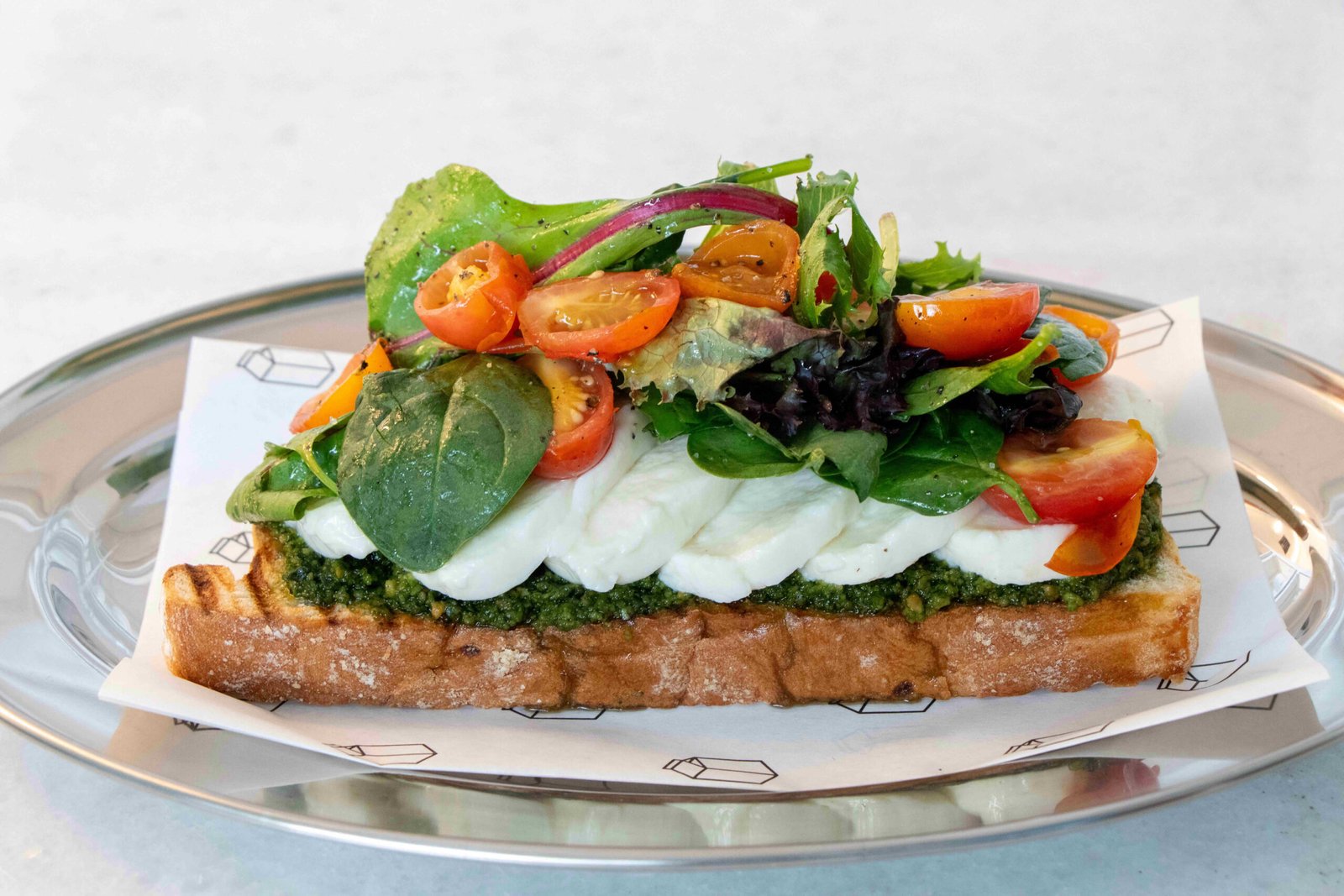 PESTO + MOZARELLA REBANADO (90GR) + CHILI OIL + TOMATES CHERRY ROSTIZADOS + MIX DE LECHUGAS + VINAGRETA DE LA CASA + PAN DE AJO