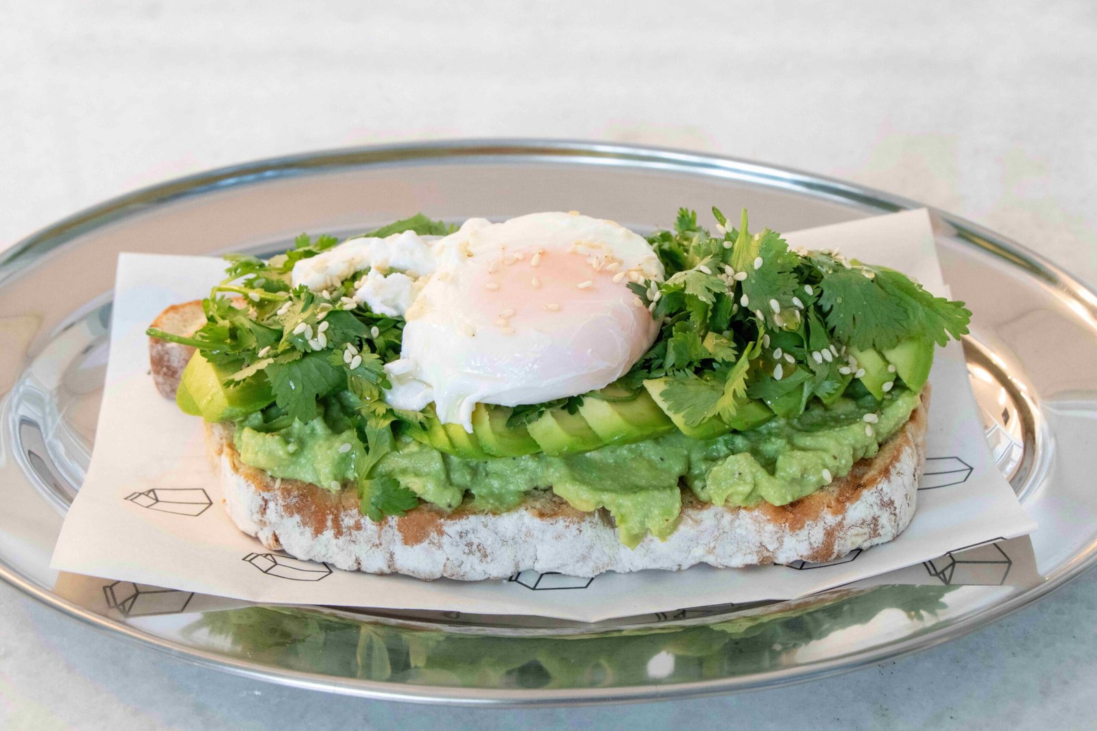 CREMOSO DE AGUACATE(100GR) Y RICOTTA + REBANADAS DE AGUACATE + HUEVO POCHADO + HOT HONEY CHILI OIL + AJONJOLÍ + ENSALADA DE CILANTRO + PAN DE AJO