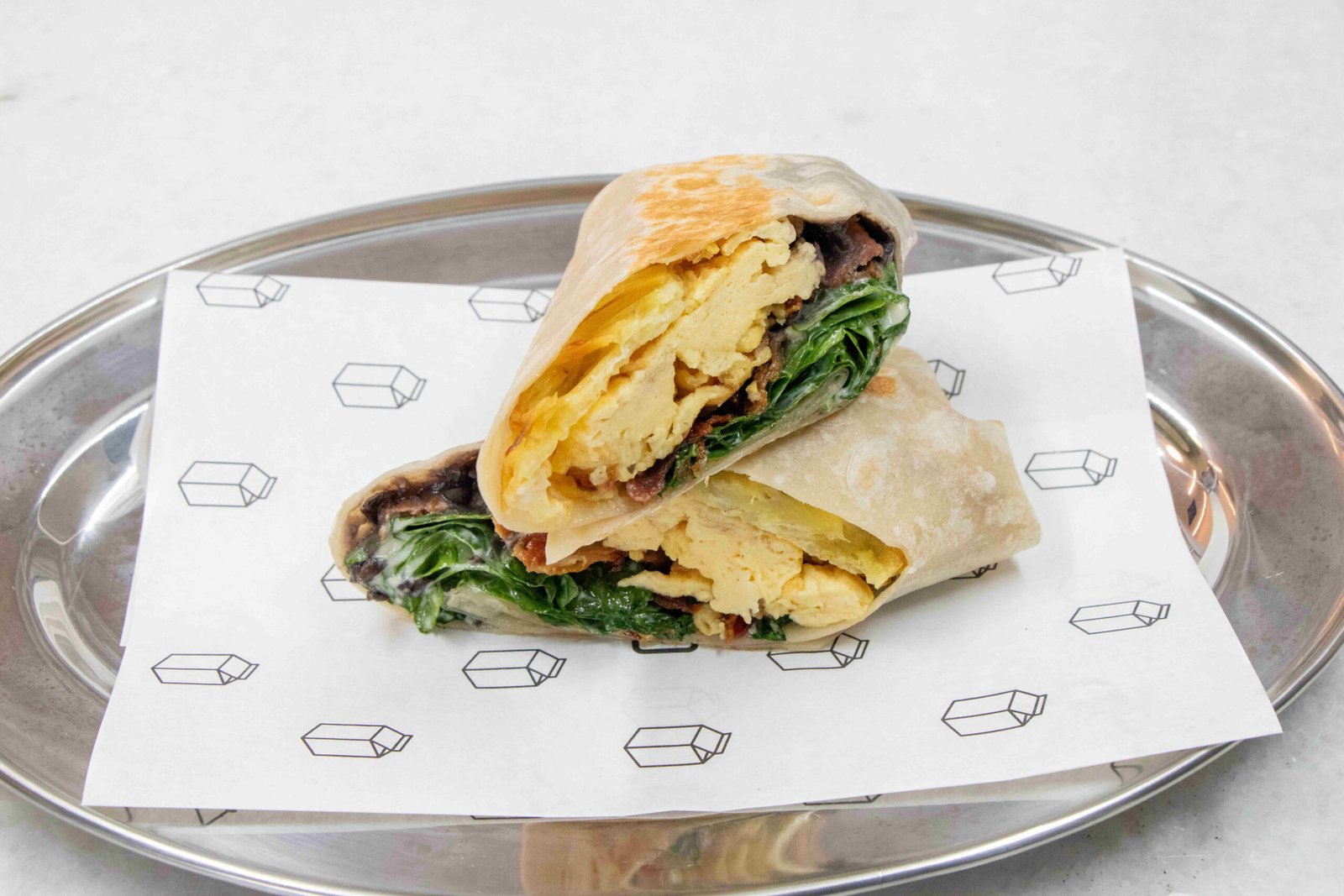 TORTILLA DE HARINA + UNTABLE DE FRIJOL + ALIOLI DE LA CASA + HUEVO(120GR) REVUELTO + TOCINO + PAPA HASHBROWN + ESPINACA