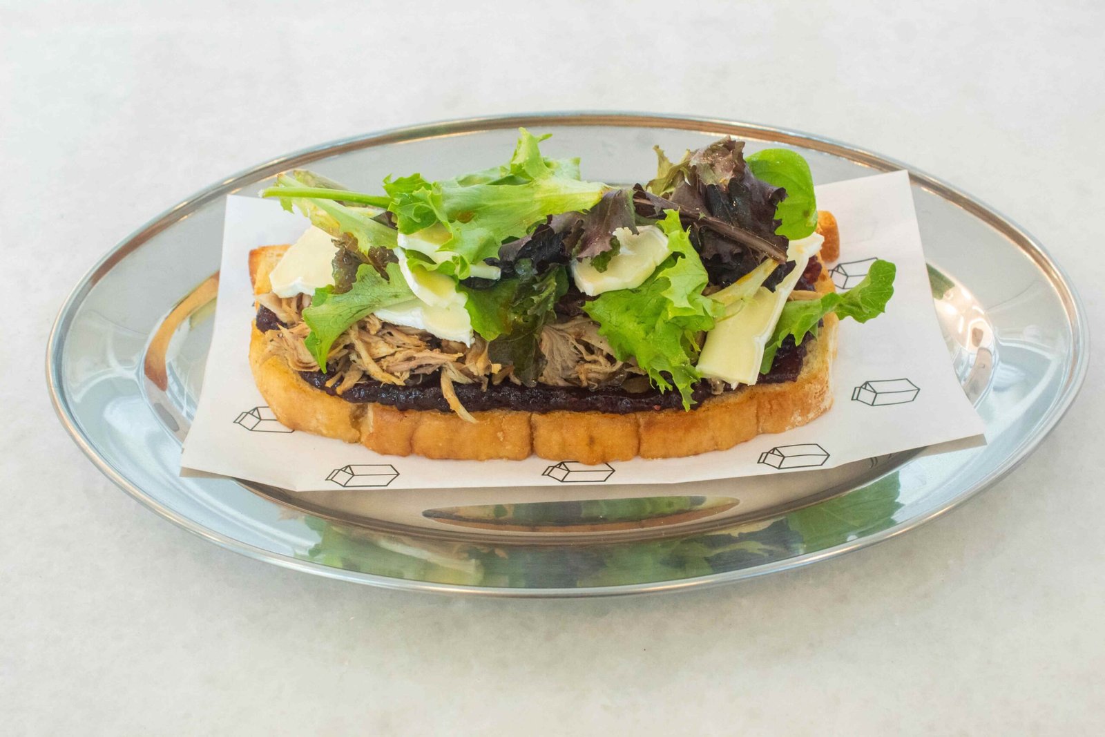 PATO (85GR) HORNEADO ESTILO LA LECHE + MERMELADA DE ARANDANO + MIX DE HOJAS CON ACEITE DE CHILES + QUESO BRIE + PAN DE AJO