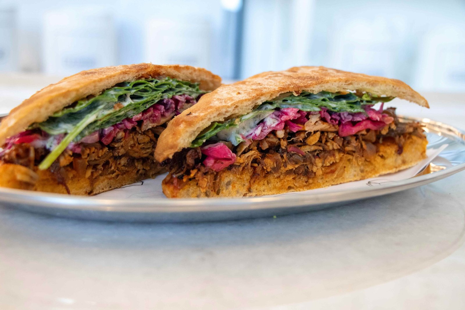 PIERNA DE CERDO DESMENUZADA (100GR) CON PASTA DE CHILES Y CEBOLLA CARAMELIZADA + ALIOLI DE LA CASA + CURTIDO DE CEBOLLA Y COL MORADA + ESPINACA BABY + TABLA MASA MADRE