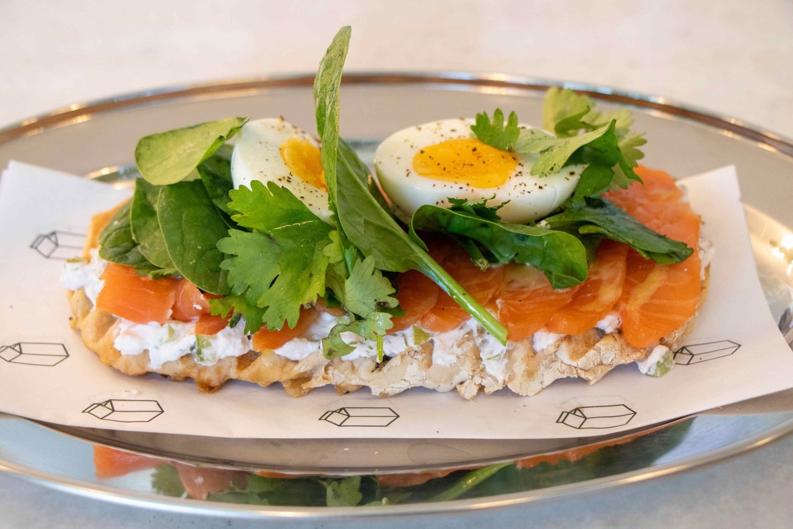 LÁMINAS DE SALMÓN CURADO (65GR) + HUEVO + UNTABLE DE JOCOQUE + MOSTAZA DULCE + MIX DE CILANTRO CON ESPINACA + PAN DE AJO